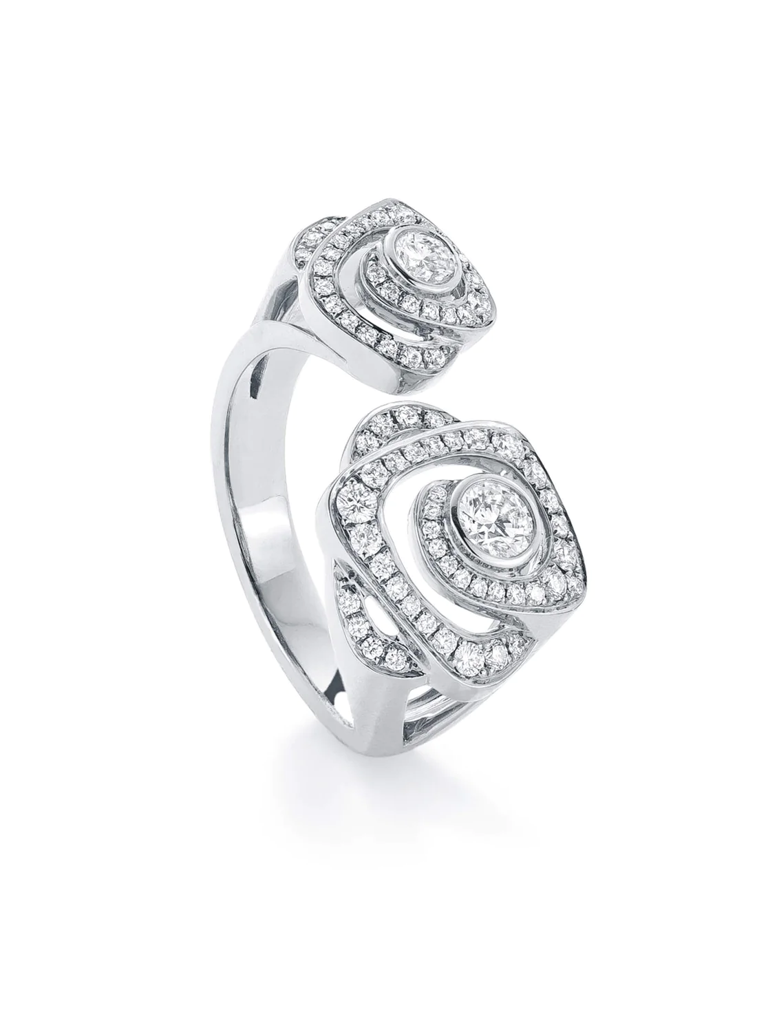 An ancient symbol of love and beauty; the rose is celebrated worldwide as an enduring symbol of romance. Featuring two diamond set roses in a platinum setting. This Maymay Rose design ring set with diamonds in platinum. The total diamond weight is approximately 0.83 carats.